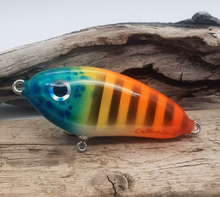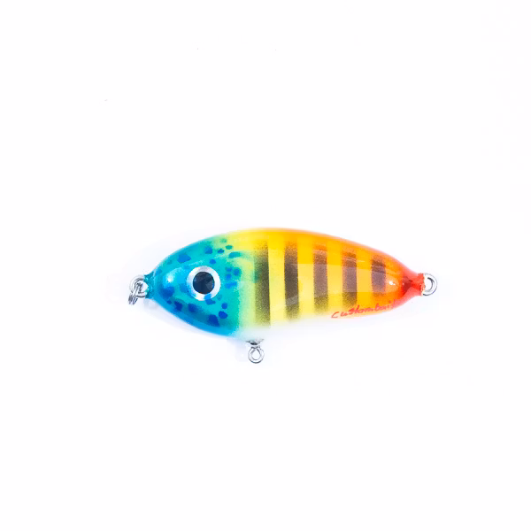 Detta lilla jerkbait/slider väger in på ca 50 gram (OBS! vikten  kan variera då allt är handgjort samt vissa metoder kräver mer lager lack)  och är 11cm från ögla till ögla. Betet är viktat att sjunka lite snabbare än slowsink. Du kan själv laborera med sjunkhastighet genom att byta till  tyngre krok osv.
